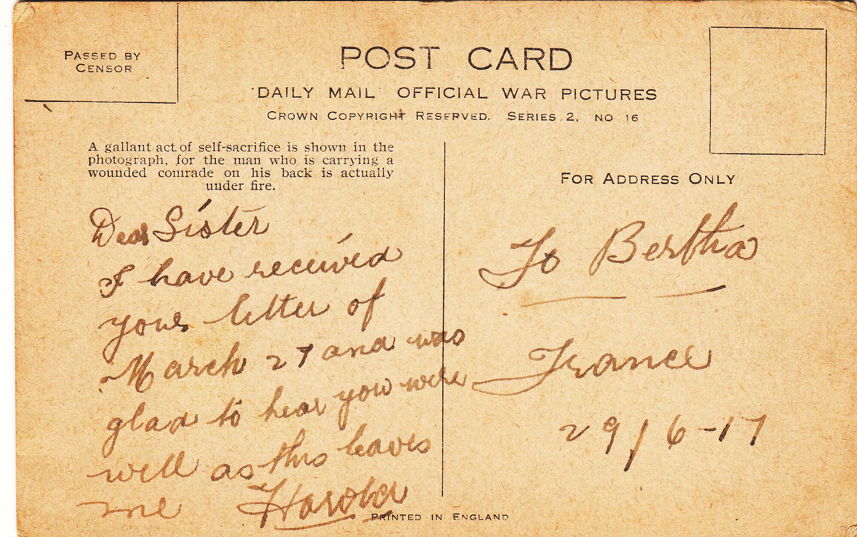 post card from France to his sister