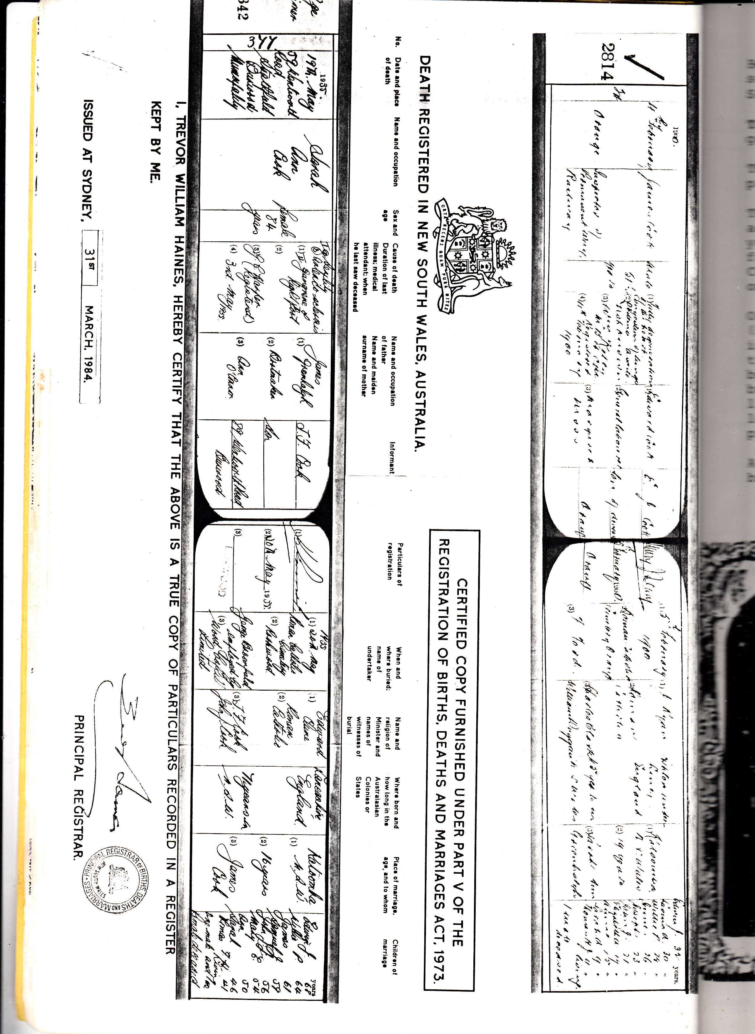 death cert Sarah Ann Cook